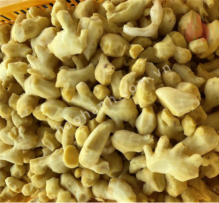 Fresh ginger is carefully selected according to quality standards, then thoroughly washed with a high-pressure water system, peeled using chemical-free technology, sliced or kept whole (depending on customer needs), and quickly frozen. The deep freezing process preserves the natural aroma, pungent essential oils, and medicinal value of ginger, while extending shelf life to 18–24 months at -18°C without the use of preservatives.